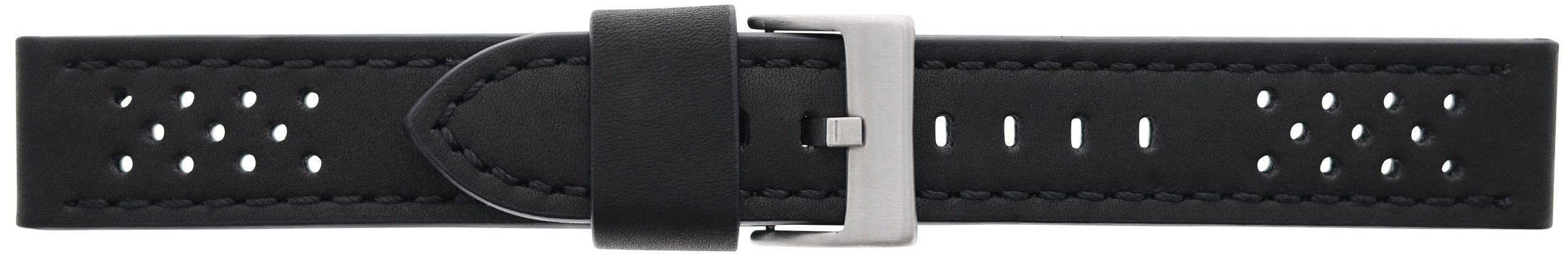 This Italian calfskin watchband features perforated sections on both parts of the watchband that are close to the watchcase. It comes standard with a heavy duty stainless steel buckle. A gold plated buckle can be requested at an additional charge.