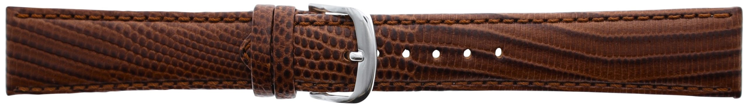 This watchstrap features an iguana grain on calfskin leather. It is manufactured using the remborde construction method and features both a fixed and moving keeper.