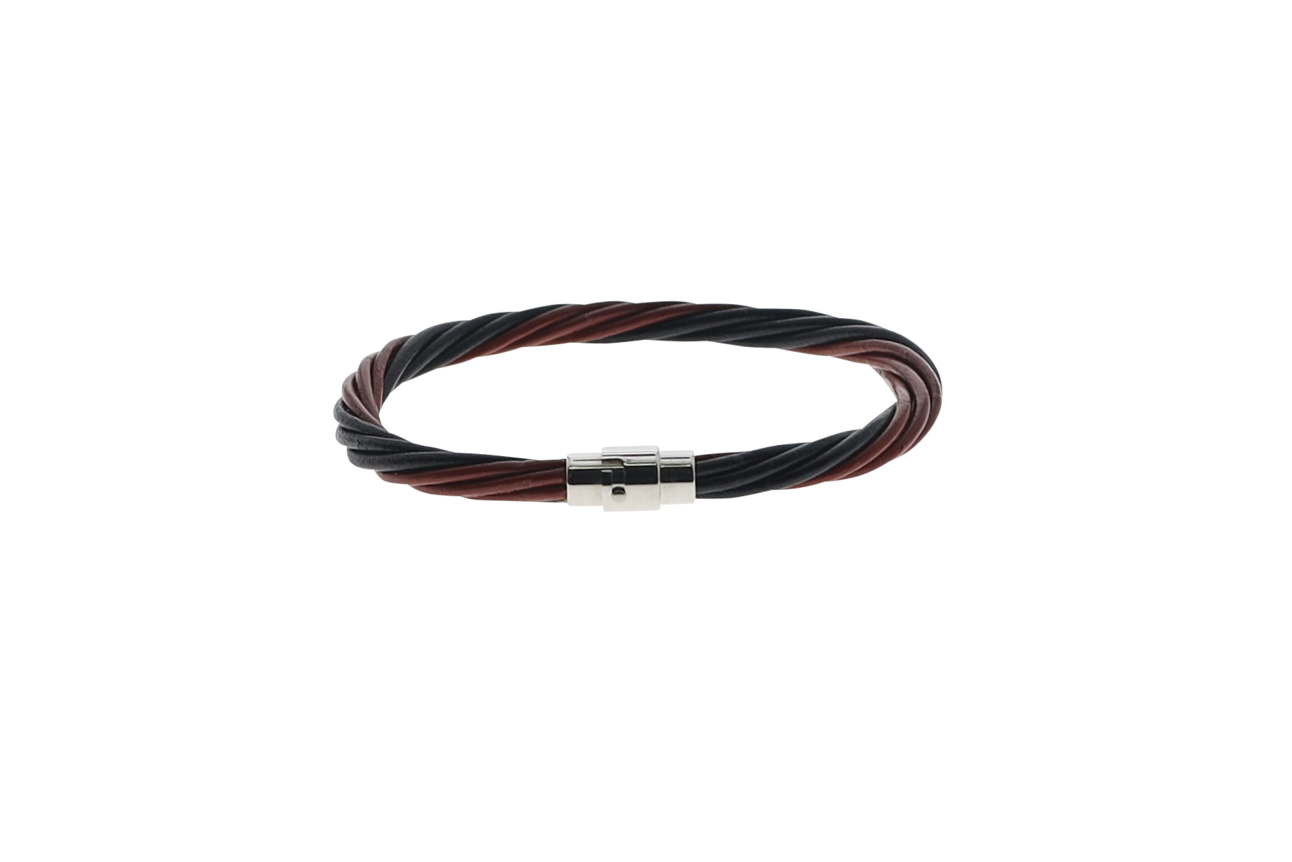 This Wrapit bracelet features 7 strands of Black & Brown leather leading up to a bayonet clasp.